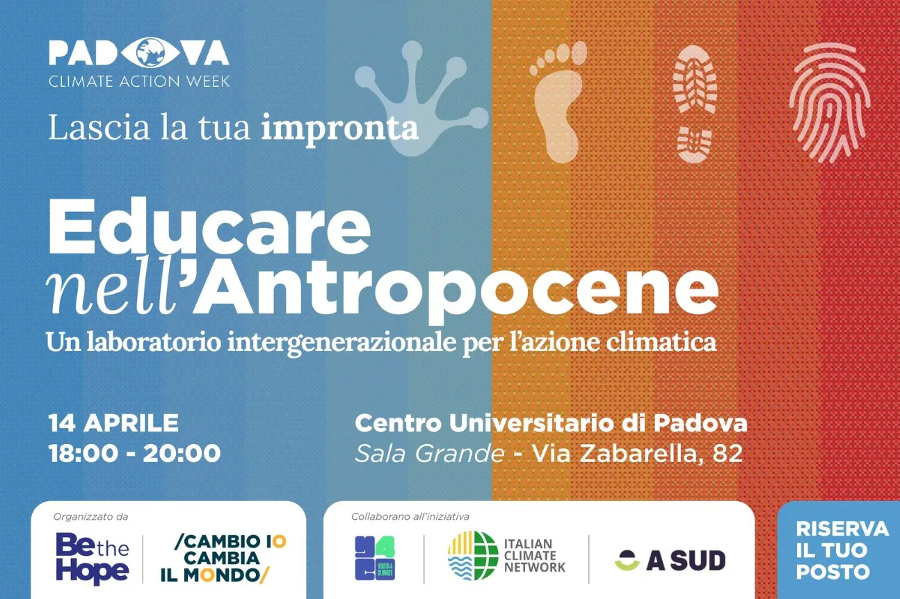 Martedì 14 aprile al Centro Universitario di Padova si terrà “Educare nell’Antropocene. Un laboratorio intergenerazionale per l’azione climatica”, un incontro promosso nell’ambito della Padova Climate Action Week per interrogarsi su come l’educazione possa trasformarsi di fronte alla crisi climatica.