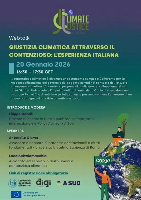 Martedì 20 gennaio, Climate Justice Living Lab ospiterà un nuovo webtalk sulla giustizia climatica e i casi italiani di contenzioso climatico.
