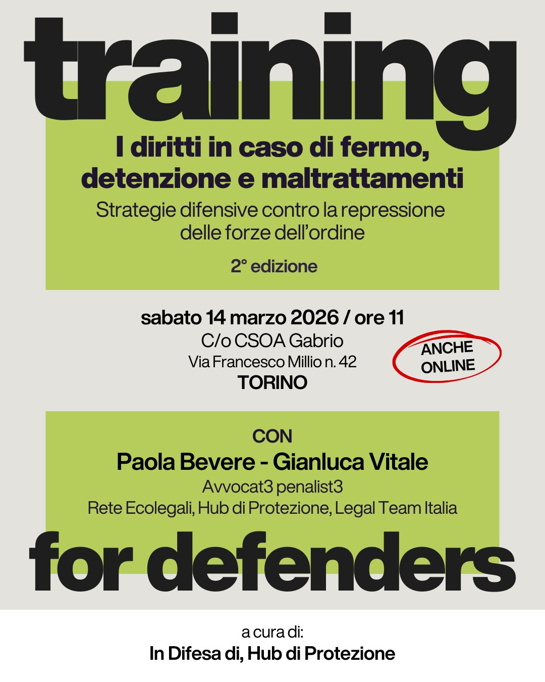 Sabato 14 marzo 2026 alle ore 11 si terrà a Torino, presso CSOA Gabrio (via Francesco Millio 42), la seconda edizione del training dedicato ai diritti in caso di fermo, detenzione e maltrattamenti. L’incontro sarà seguibile anche online.