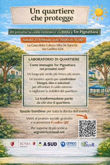 Sabato 21 febbraio, dalle 10 alle 15, alla Casa delle Culture di Villa De Santis, a Roma, nel quartiere Tor Pignattara, avviamo un percorso collettivo per affrontare il caldo estremo e ripensare gli spazi pubblici a partire dai bisogni di chi il quartiere lo vive ogni giorno.