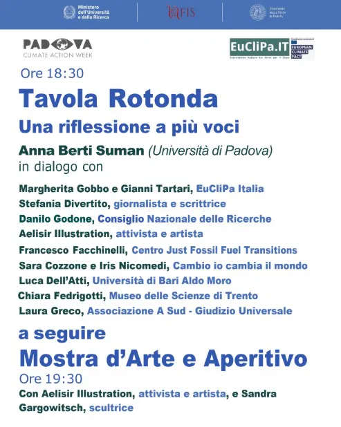 La serata si apre con una tavola rotonda che mette in dialogo ricerca, giornalismo, arte e attivismo, con interventi di Anna Berti Suman (Università di Padova), in dialogo con Margherita Gobbo e Giovanni Tartari (EuCli.Pa Italia), Stefania Divertito (giornalista scientifica), Danilo Godone (Consiglio Nazionale delle Ricerche), Aelisir Illustration (attivista e artista), Francesco Facchinelli (Centro di Eccellenza Just Fossil Fuel Transitions), Sara Cozzone e Iris Nicomedi (Progetto Cambio io cambia il mondo), Luca Dell’Atti (Università di Bari Aldo Moro), Chiara Fedrigotti (MUSE Trento) e Laura Greco (Associazione A Sud – Causa Giudizio Universale).